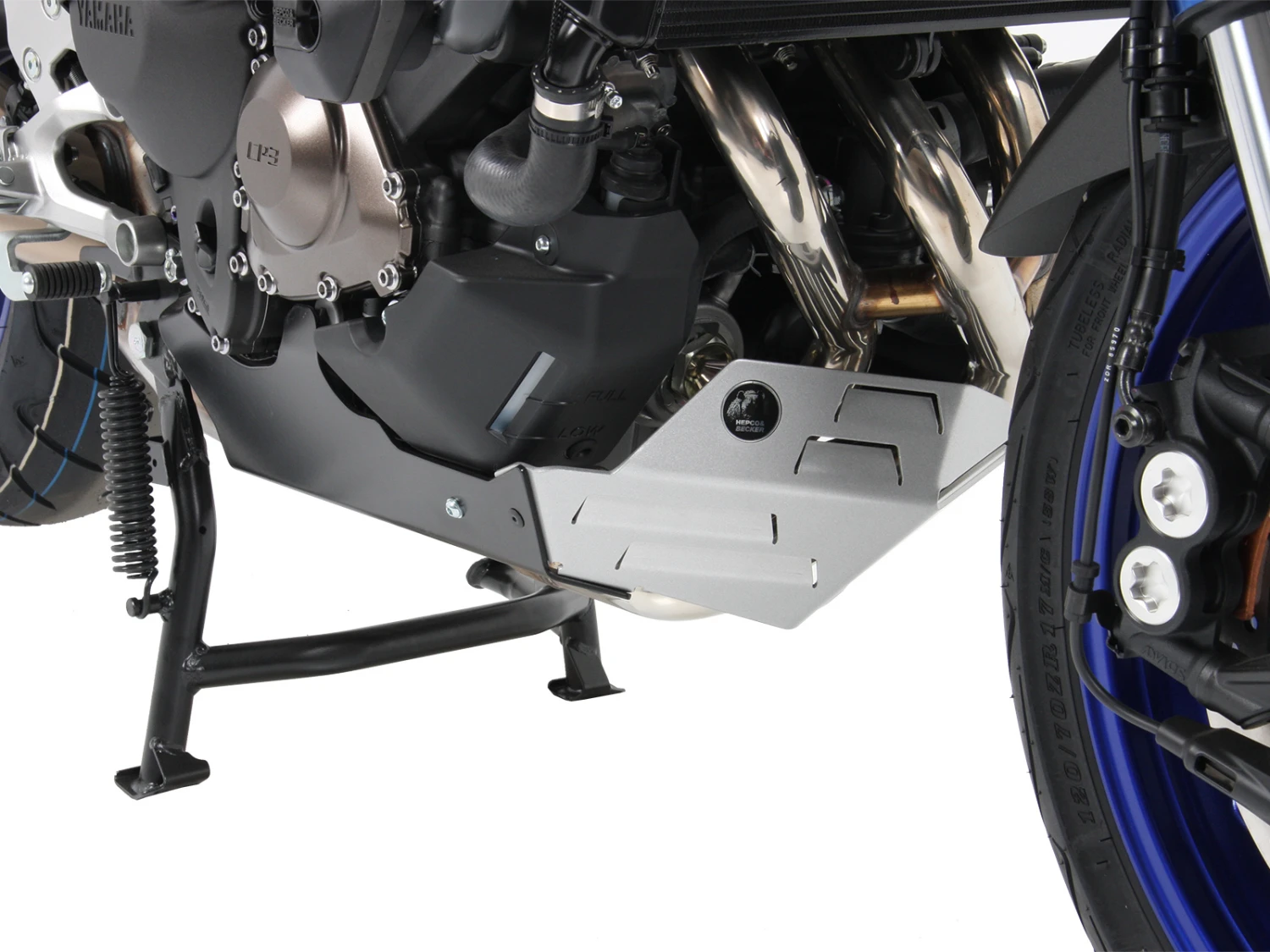While not a true motorcycle sump guard, the Bug Spoiler for Yamaha’s MT range from Hepco Becker is a strong design that offers great side & frontal coverage. all hardware included and are made from brushed alloy nylon.ย Most importantly they integrate with Hepco & Becker center stands & engine guards