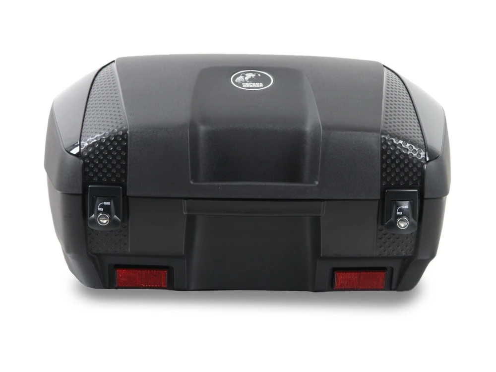 Hepco & Becker’s classic Junior style top case is off set with colour in the Junior Flash Black TC55. With it’s brilliant gloss black corners, it retains the classic twin lock lid and offering of 55 liters of storage with space for 2 full-face helmets or one and more.ย It is completely water-tight thanks to a special seal and internally, you have aย floor mat and a small document holder, plus of course the TC55 securely key locks onto all H&B top case carriers (rear racks and aluminum racks).ย ย But now the outer corners (or shoulders) are a detachable panel.ย This means you can either leave the Flash as standard in silver finish OR have it colour matched to your bike!ย Want the standard version TC55 or a satin silver version Junior Flash