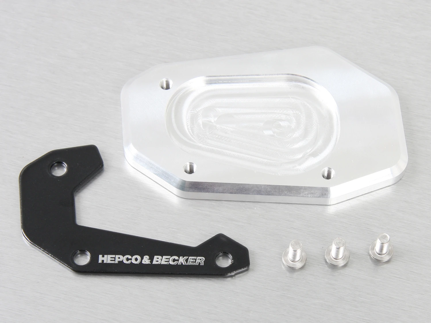With a Hepco Becker Side Stand Enlargement (kick stand) fitted to your BMW R NineT, stabilty when parked on soft surfaces is assured. Being fully loaded or parking on unpaved surface can cause the motorcycle side stand to begin to sink. Hepco & Beckers precisely contourmilled side stand enlargement stops this danger! More than 100% larger contact area Quickly bolted to the side stand Contour milled thick alloy base Secure positioning of the machine on all surfaces Black anodized clamp on top
