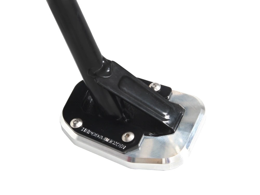 A precisely shaped milled plate to spread the weight, which is quickly screwed to the side stand, relieves this danger.