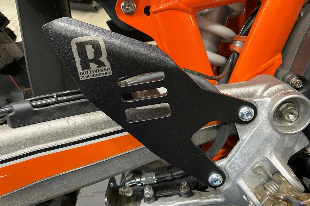 If you can’t find a convenient location to tie your luggage to, if you don’t like running the stock passenger pegs, orย don’t like the flimsy plastic heel guard replacements the factory offers, then you may really like our Rottweiler Performance heal guards for the 690, 700 and 701 Enduro/SM.