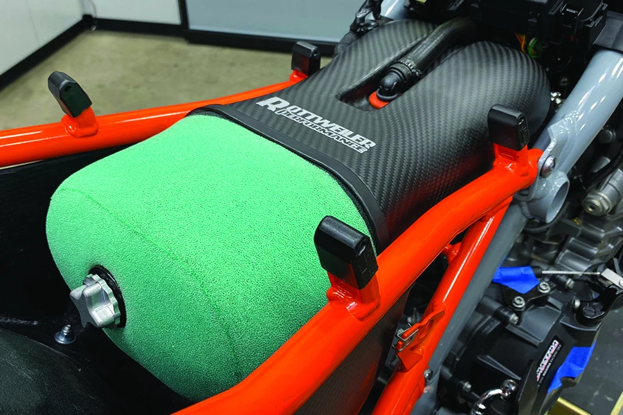 As usual, we didn’t stop there with the improvements. The stock airbox once again fails the white glove tests in spectacular fashion and is prone to multiple sealing issues leading to worn valves, valve seats, cylinder walls and eventually possible engine failure. World renown for their quality craftsmanship and class-leading filtration capabilities, we contracted none other than Twin Air Filters to construct the foam element for our new intake system, leveraging their stellar reputation as OEM standard on all of KTM’s enduro series motorcycles. This means you are getting the best of both worlds: Rottweiler design mated with Twin Air’s quality. An unbeatable package.ย