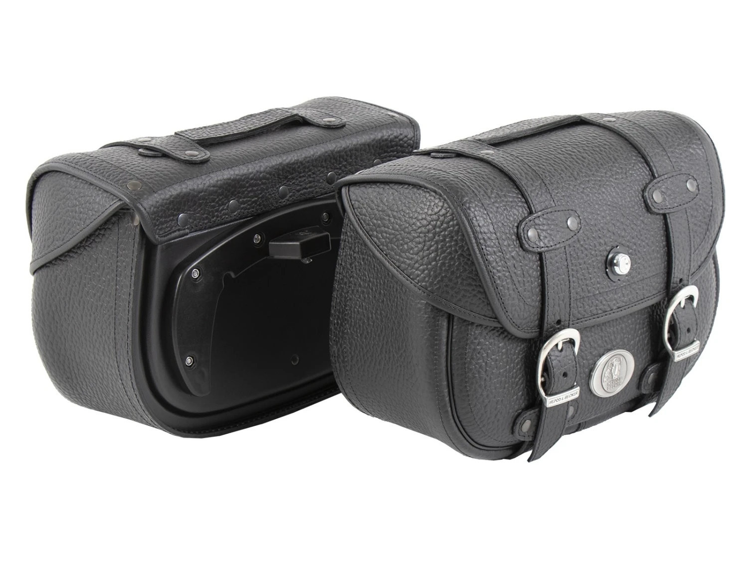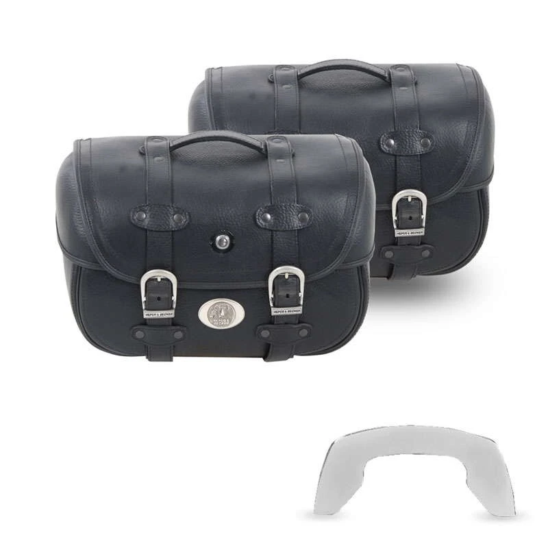 With their dynamic, timeless look, theseΒ HEPCO&BECKERΒ saddlebags enhance any chopper. Our saddlebag leather collection is made of smooth pure 3-4mm thick cowhide with black aniline dye throughout. Extra strong, tearresistant seams for the best stability and long life. All of our saddlebags are produced especially for us in our traditional leather craft shop. The bags hold their shape extremely well thanks to hidden shape reinforcement and a plastic double rear wall – no dropping, no flapping.