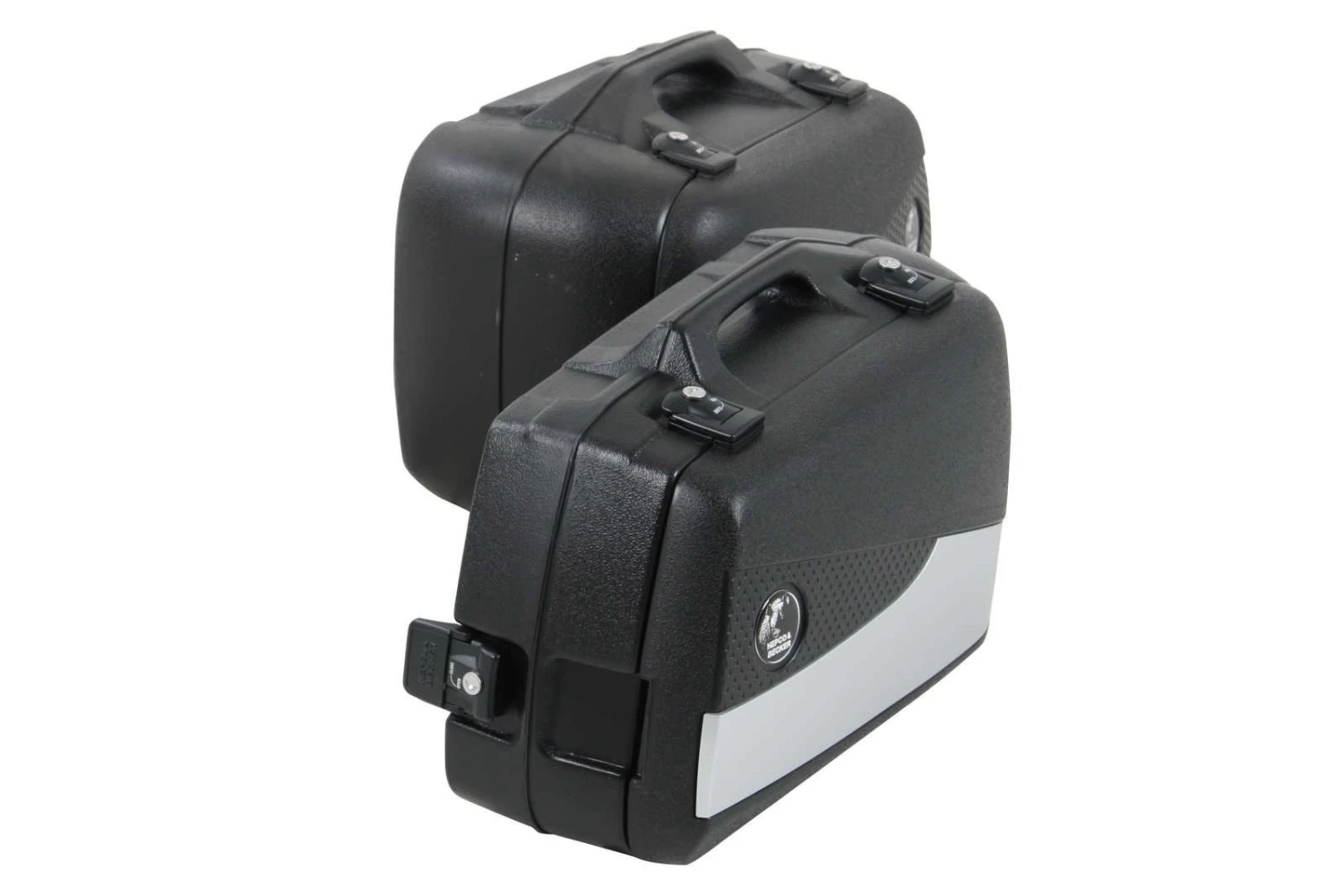 Junior Flash cases available as an Enduro set! A comibination of 2 different case sizes for those who like symmetry with different luggage carrier widths due to the high exhaust system position typical of Adventure motorcycles. The Junior Enduro set can remedy this asymmetry. Depending on which side the muffler is on, we provide the right combination of 30 or 40 liters case. This set features 40Lt Left and 30Lt Right side cases. The silver side panel is detachable and can be coated to suit your bike too.