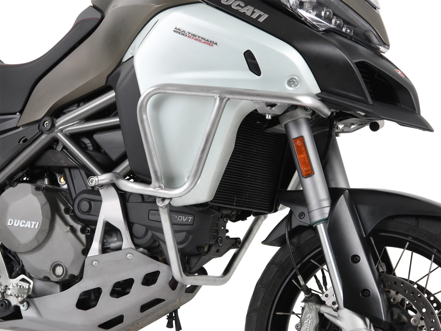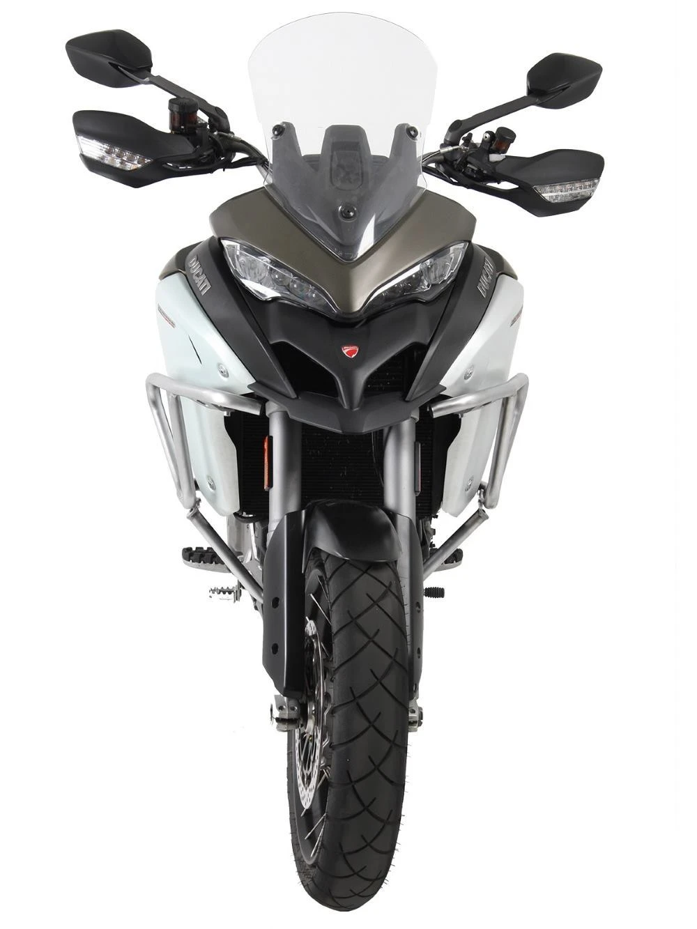 A Hepco & Becker motorcycle Tank Guard (aka ‘Tank Bars’) for your Ducati Multistrada 950 from 2017, offers upper protection for both the engine and the side of the bike during pushovers or falls. Our Tank Guards are limited mostly to adventure motorcycles. Each tank guard is a bike specific design for perfect match and easy installation. Manufactured from high quality mild steel in 25mm diameter, they assist in limiting damage in a mishap particularly where the bike tips heavily over, as many customers have attested. This guard is made 3 piece in stainless steel