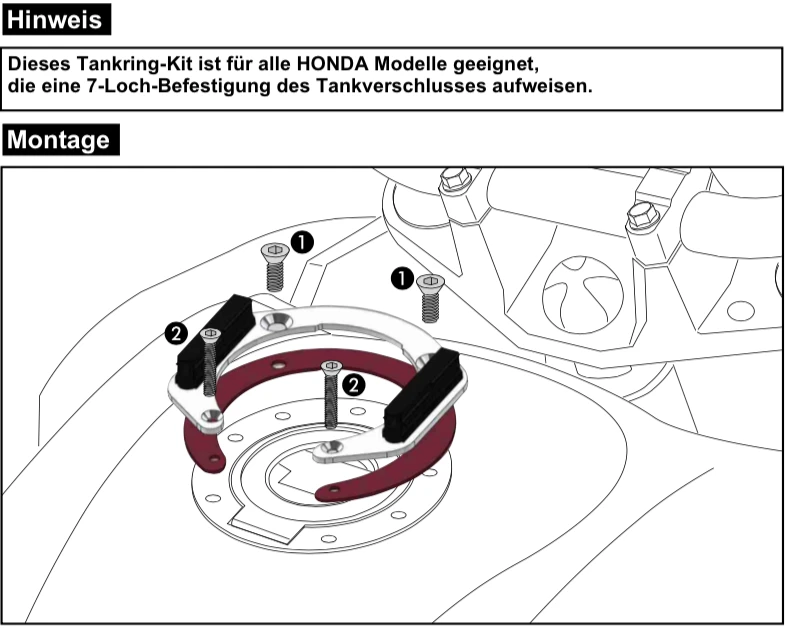 This model of the HEPCO &ย BECKERย Lock it Tankring 7 hole is for mounting Hepco & Becker tankbags onto selected Honda models.ย Lock It tank ring fastening of tank bags is a big advance for attaching them to the motorcycle. It is an innovative tank bag attachment and Fidlock patented as the problems associated with positioning the tank bag are eliminated by magnetic centering.ย ย The side ribs attached to the magnets also mechanically secure the tank bag. When the lock is released, the poles of the magnets match and the tank bag is released from the attachment.ย can be attached to the tank filler port. The tank bagโs base plate shields the magnetic field of the tank ringโs two permanent magnets, so that credit cards and electronic devices cannot be damaged.