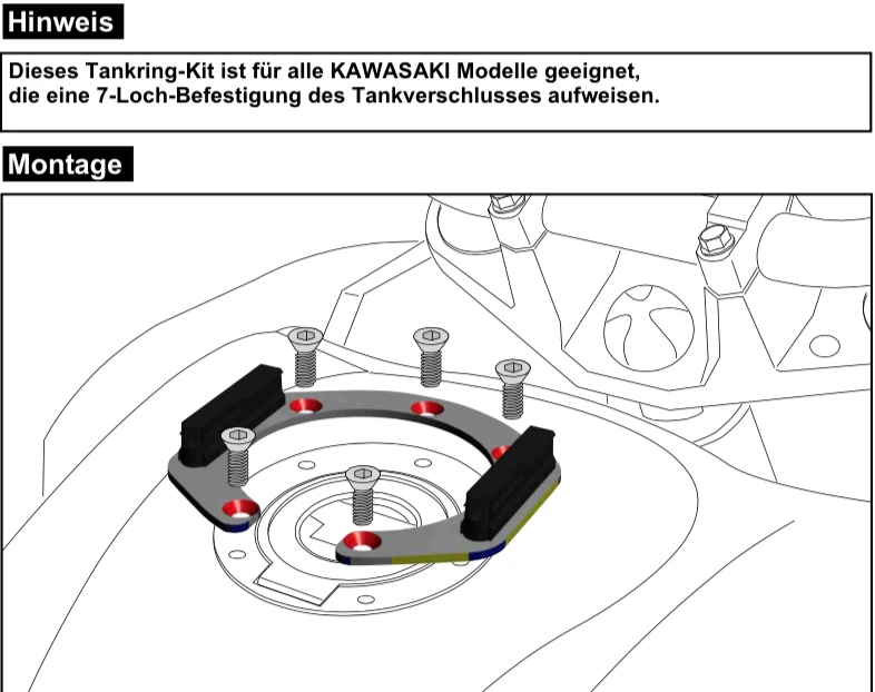 This model of the HEPCO &ย BECKERย Lock it Tankring with 7 hole is for mounting Hepco & Becker tankbags onto selected Kawasaki models.ย Lock It tank ring fastening of tank bags is a big advance for attaching them to the motorcycle. It is an innovative tank bag attachment and Fidlock patented as the problems associated with positioning the tank bag are eliminated by magnetic centering.ย ย The side ribs attached to the magnets also mechanically secure the tank bag. When the lock is released, the poles of the magnets match and the tank bag is released from the attachment.ย can be attached to the tank filler port. The tank bagโs base plate shields the magnetic field of the tank ringโs two permanent magnets, so that credit cards and electronic devices cannot be damaged.