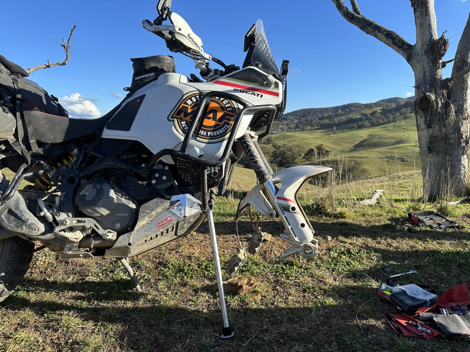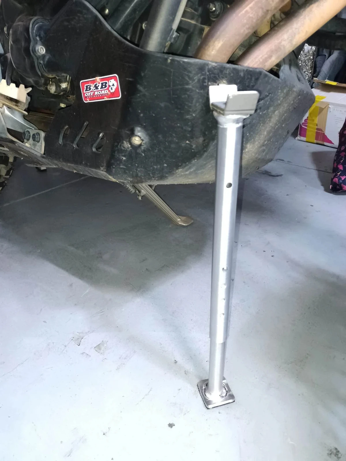 To lift the front of the bike, insert the tongue of the stand into a suitable hole in your sumpguard, or utilise your crashbars or similar stable component.